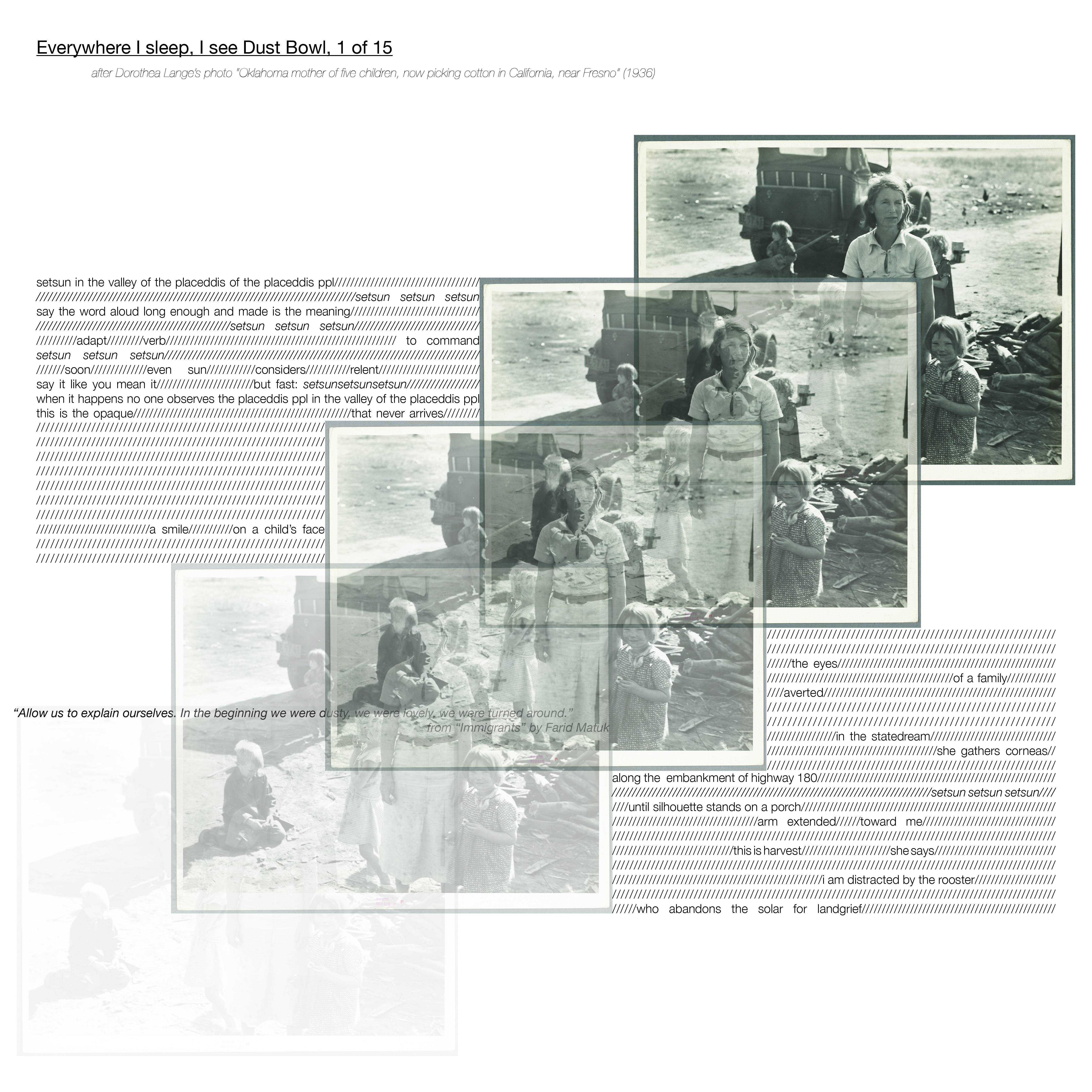 For 15 consecutive nights, in the summer of 2019, I would scour the public domain for images and sounds related to the Dust Bowl era. Very often, I would return to the imagery of Dorothea Lange in her efforts to document the Dust Bowl via the Farm Security Administration. My final waking moments of each day were centered on meditating upon my discoveries, and each morning I’d awaken, have a cup of coffee, and construct a poem. As an homage to the series, I decided I would create each poem on a 15 inch by 15 inch page. The series centers around my current work, which focuses upon the Dust Bowl, climate change, whiteness, capitalism, and technology.
