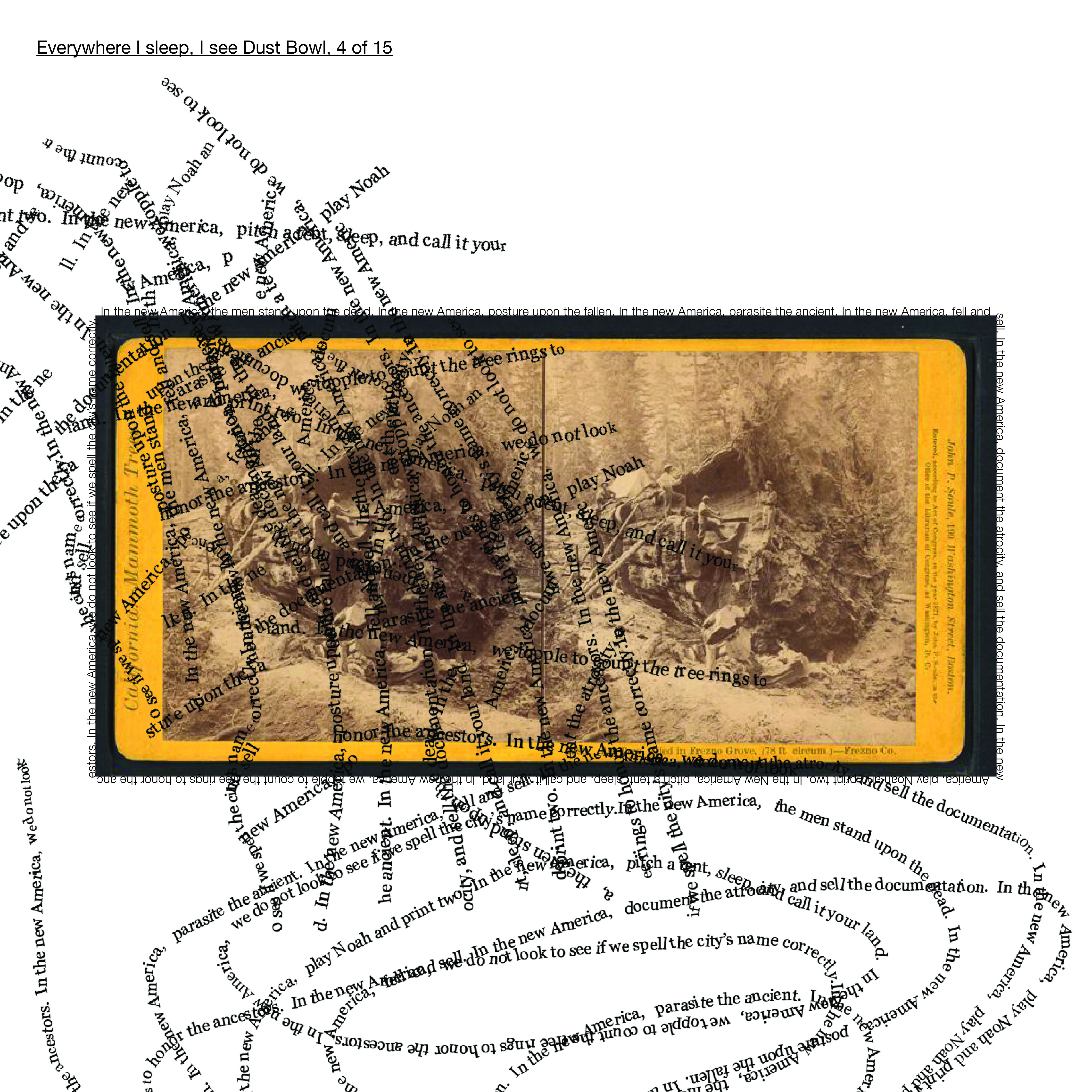 For 15 consecutive nights, in the summer of 2019, I would scour the public domain for images and sounds related to the Dust Bowl era. Very often, I would return to the imagery of Dorothea Lange in her efforts to document the Dust Bowl via the Farm Security Administration. My final waking moments of each day were centered on meditating upon my discoveries, and each morning I’d awaken, have a cup of coffee, and construct a poem. As an homage to the series, I decided I would create each poem on a 15 inch by 15 inch page. The series centers around my current work, which focuses upon the Dust Bowl, climate change, whiteness, capitalism, and technology.