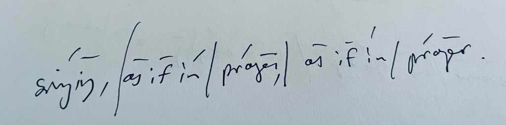 One quick note on the photograph. I know that I’ve marked anapests where there are no anapests—but that’s how I think of it in reading it, those ‘ins’ almost italicized, given stress, leaning into the idea of inside/within, within prayer, inside of it, as if in prayer…